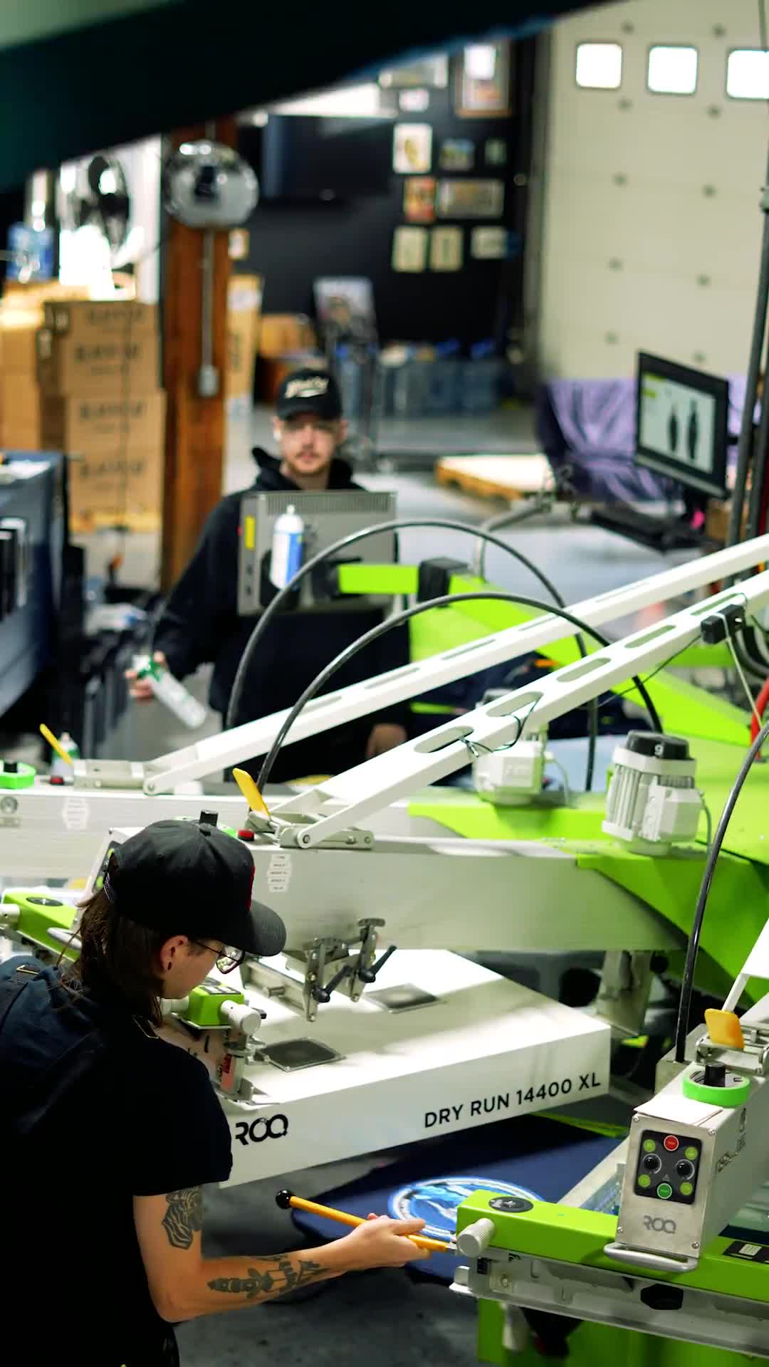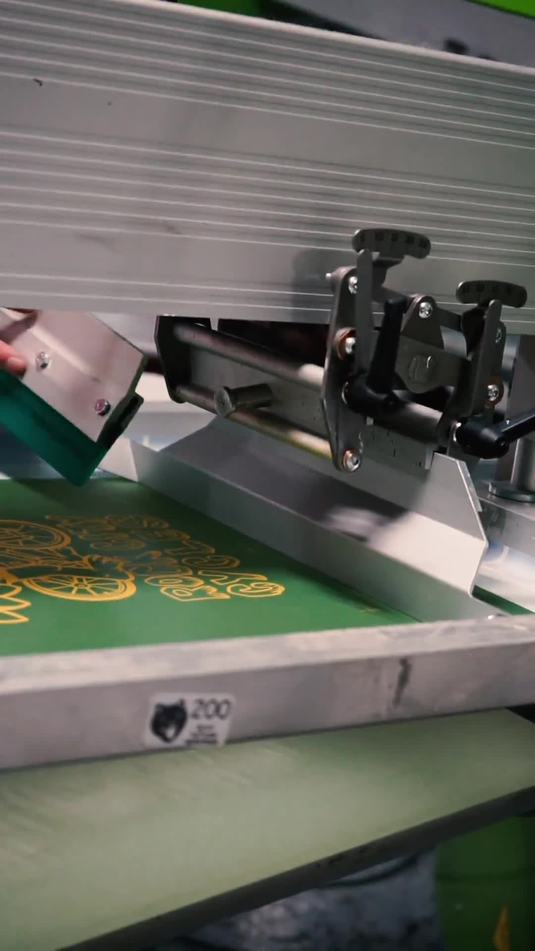 This video demonstrates the tonal printing method by printing a custom light green/sage coloured ink onto a dark green shirt.